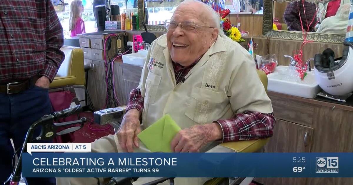 Joe Davis, 99, celebrated his birthday with customers Thursday. He's run Joe's Barber Shop near University Drive and Horne Road in Mesa since roughly 1970. He told ABC15 he's been a barber since roughly 1940.