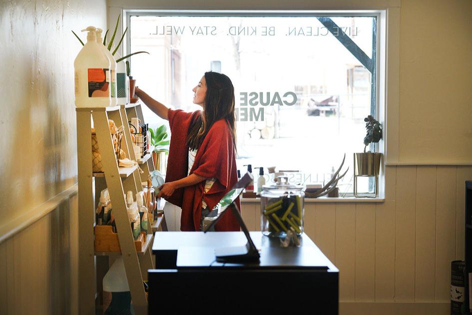 Robin Vega, owner of Cause+Medic opening this month on East Main Street, arranges some of the CBD and cleaning products her store will sell when it officially opens May 28.