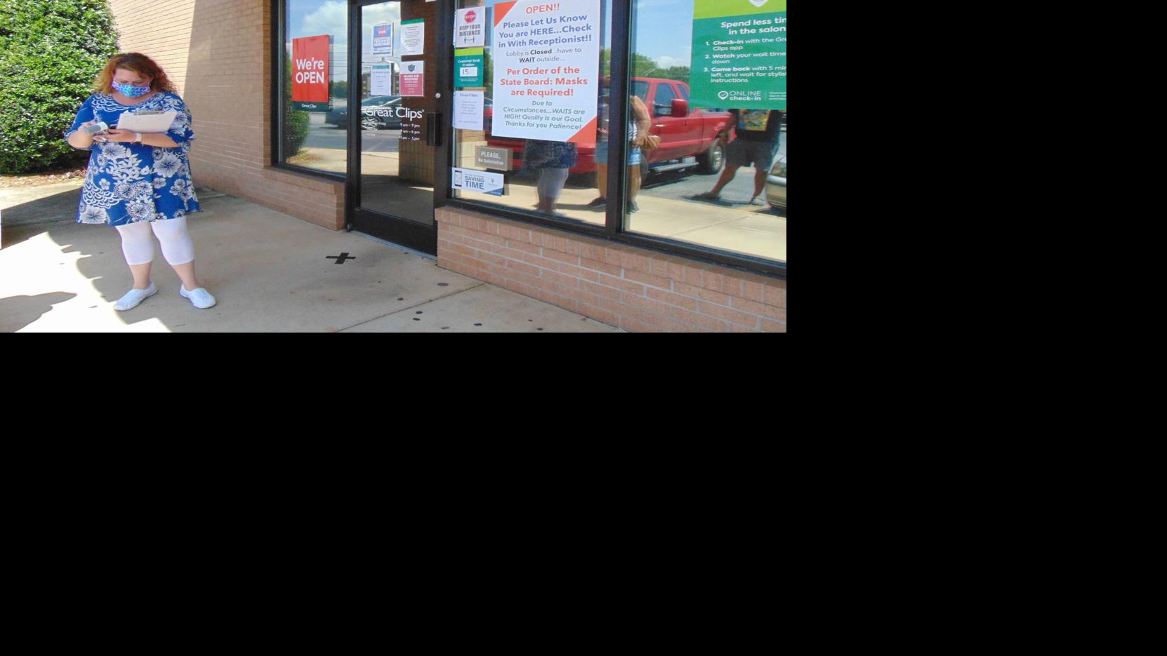 Great Clips manager Jessee Mendoza talks with customers as signs on the business show new restrictions.