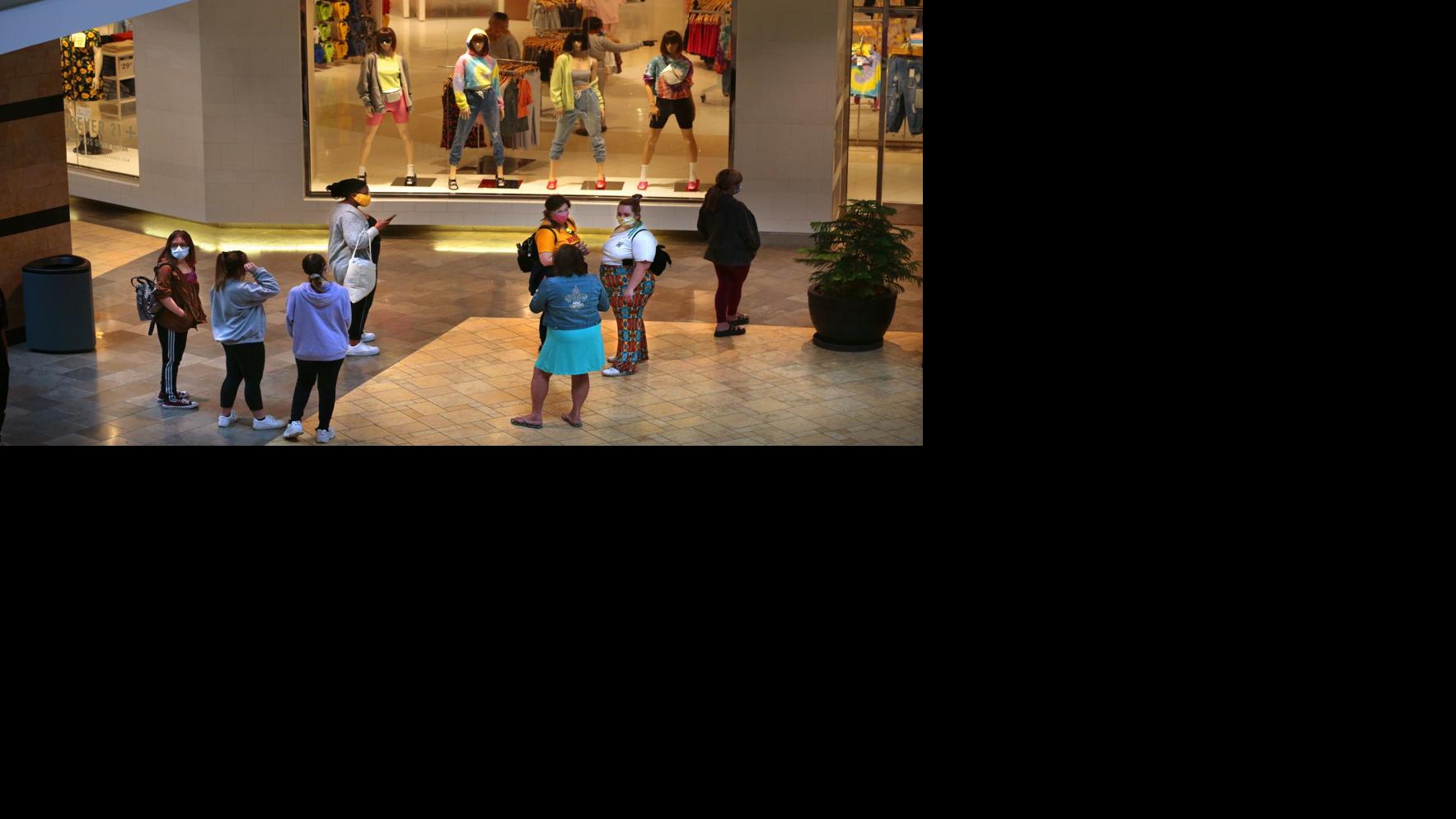 Shoppers line up to enter the Forever 21 store at the West County Center as it reopens following the coronavirus pandemic closure on Monday, May 18, 2020. Many stores in the mall were limiting the number of people allowed inside at one time. Photo by Robert Cohen, rcohen@post-dispatch.com