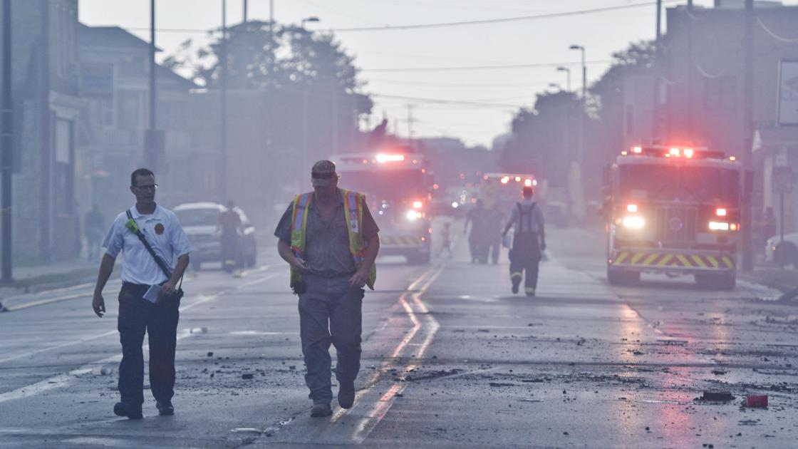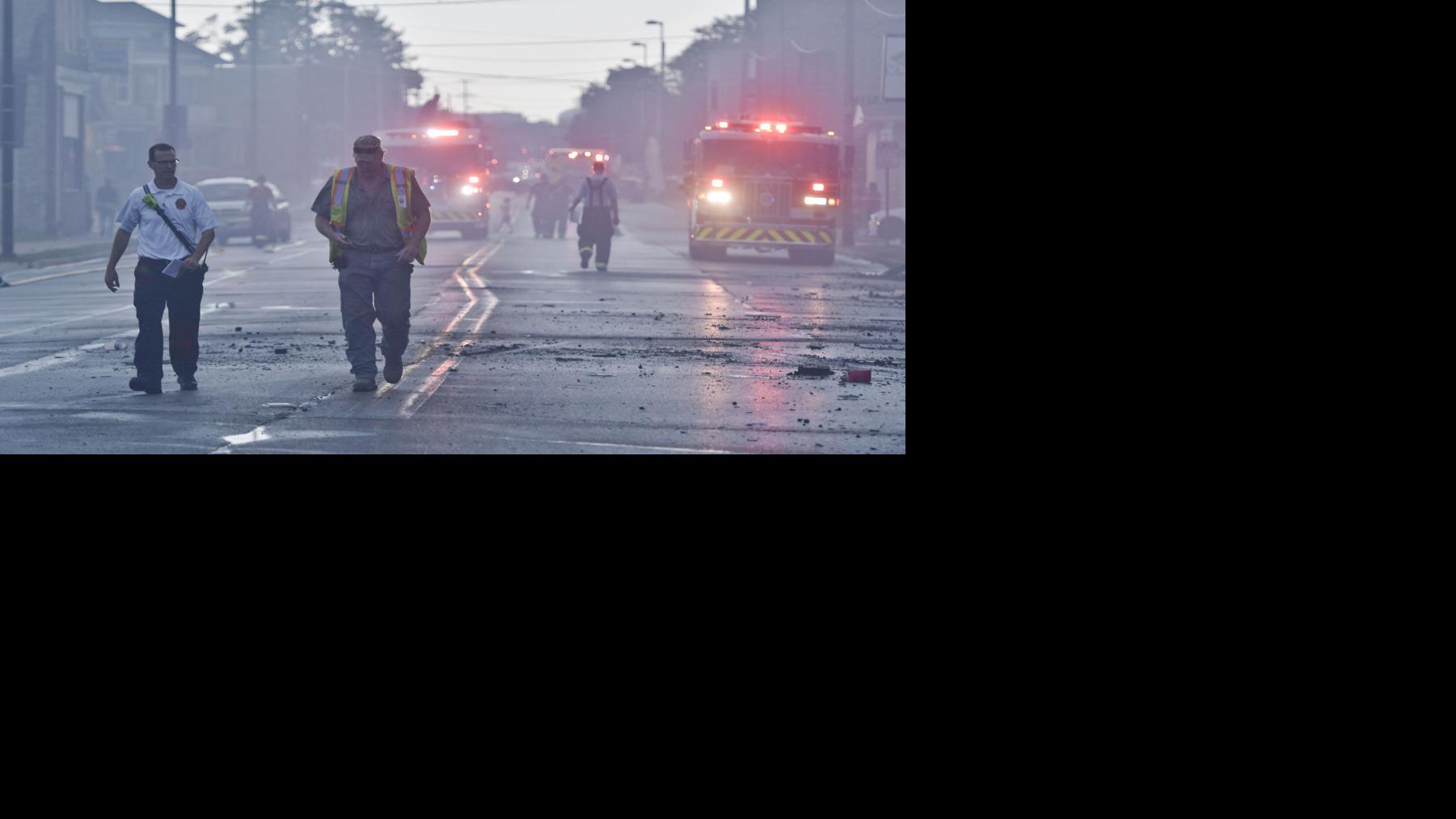 Rescue workers continue to control fires while business owners go through the damage done to their storefronts on Tuesday, Aug. 25, 2020.