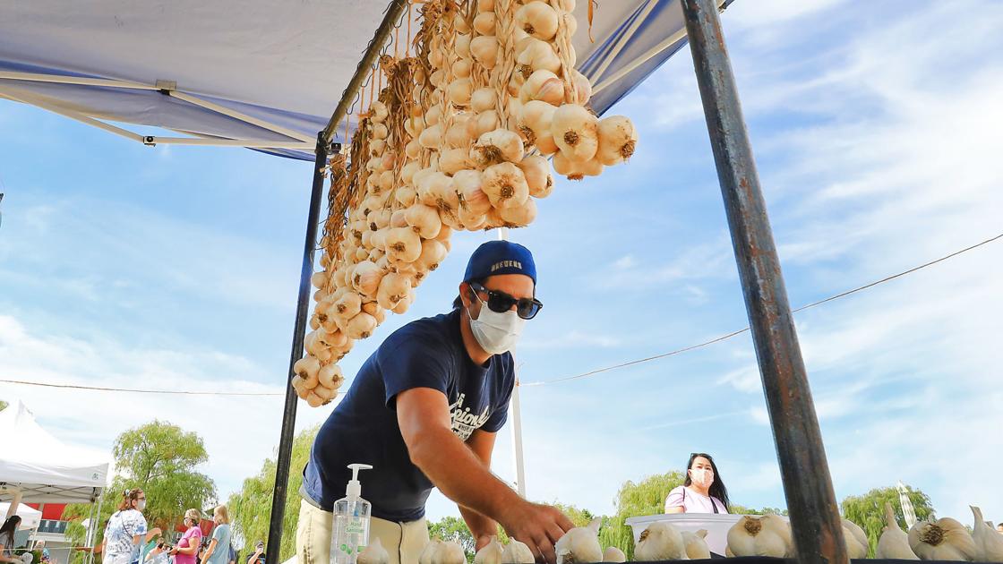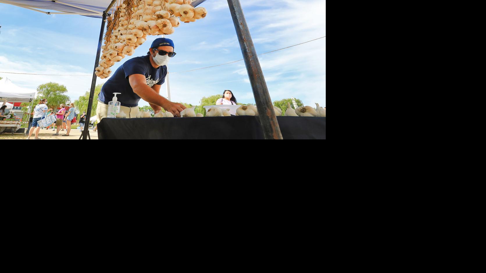 Nathan Gedko tends his display of garlic offerings during the first day of the Dane County Farmers' Market's return to walk-up shopping on Willow Island at the Alliant Energy Center in Madison Saturday.