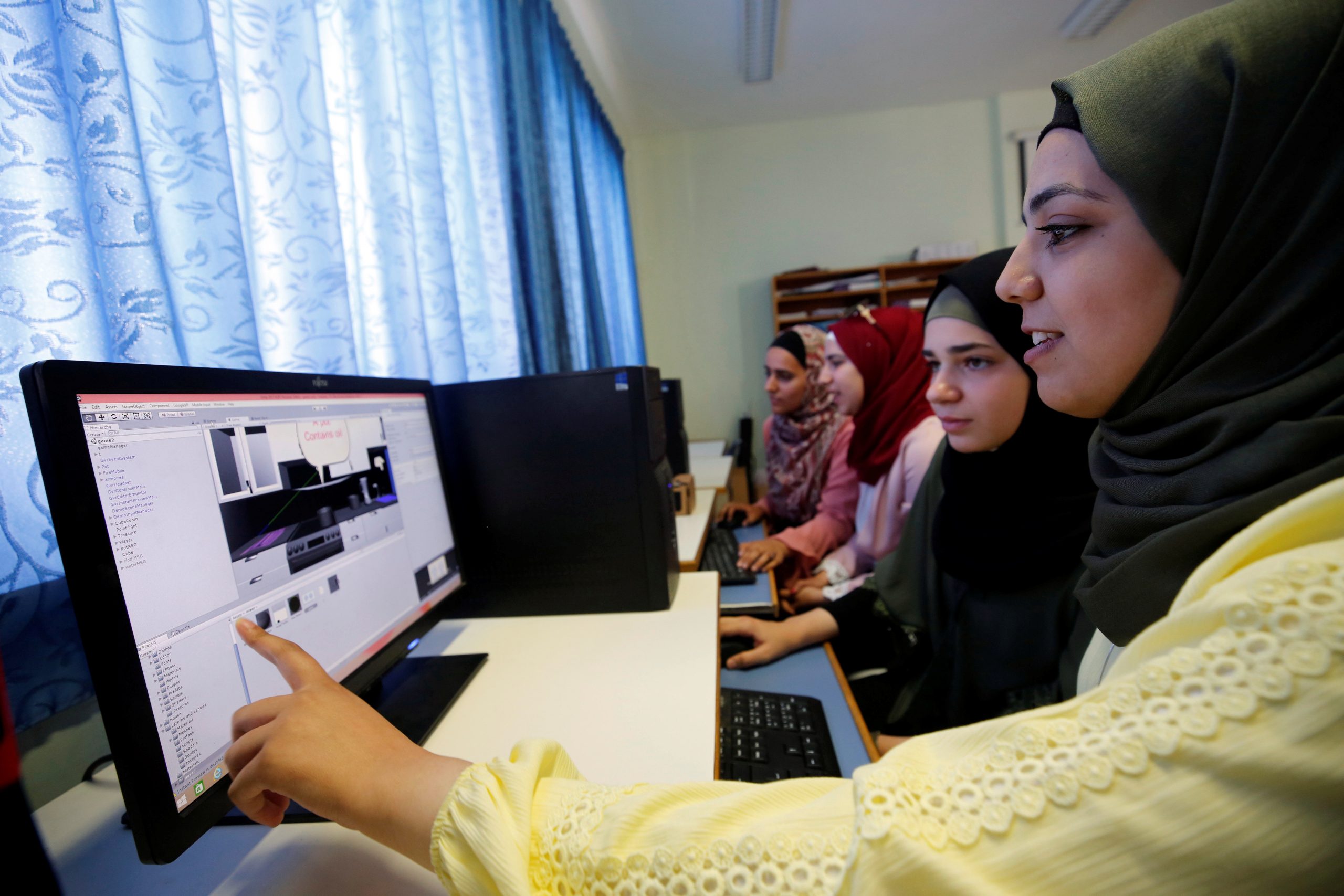 Palestinian students, who will compete in the International Technovation entrepreneurship program, work on computers at An-Najah National University in Nablus in the occupied West Bank July 25, 2018. Picture taken July 25, 2018. REUTERS/Abed Omar Qusini