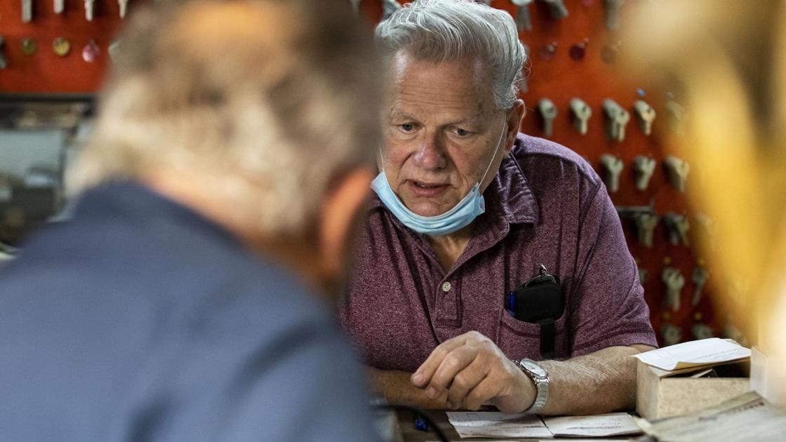 Owner Edward Mueller talks with his brother and employee Virgil Mueller at Heuer Locksmith in St. Louis on Wednesday, Sept. 16, 2020. Photo by Colter Peterson, cpeterson@post-dispatch.com