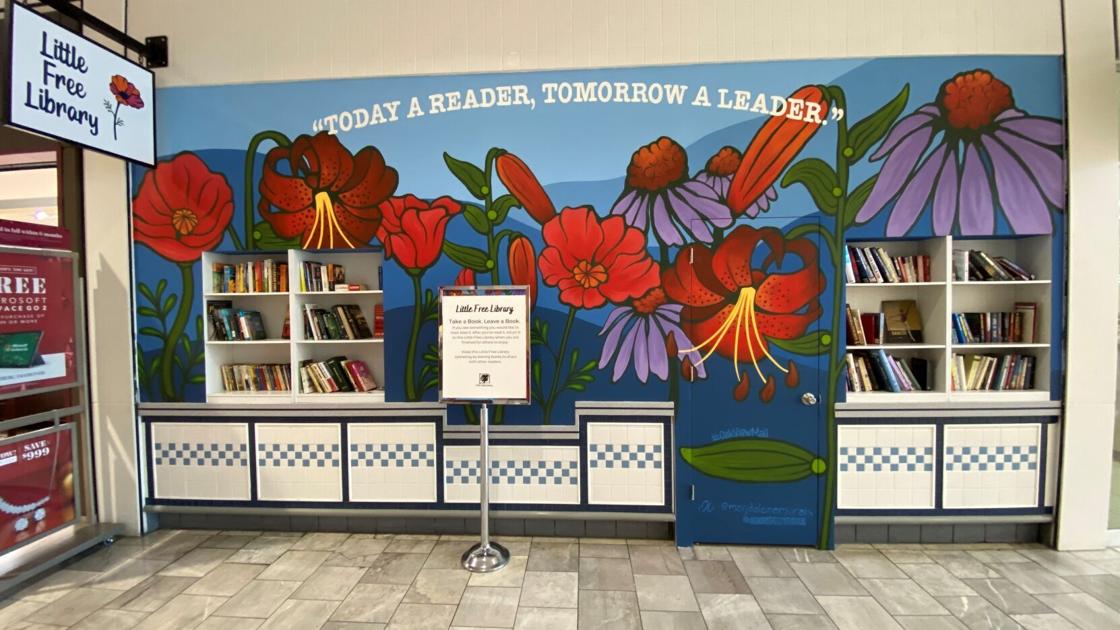 Omaha artists Maggie Webber and Sharon Manhart created the mural around the shelves at the Little Free Library at Oak View Mall.
