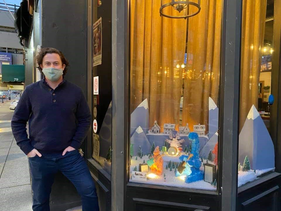 Local artist Scotty Somerville stands next to his creation of extinct dinosaurs playing music in Albany in front of The Hollow Bar & Kitchen 79 North Pearl Street as part of a rcent Small Business Saturday in downtown Albany with the theme "Winter Wonderland," showcasing storefronts creatively decorated by regional artists. He also created the windows for Miranda Deli.
