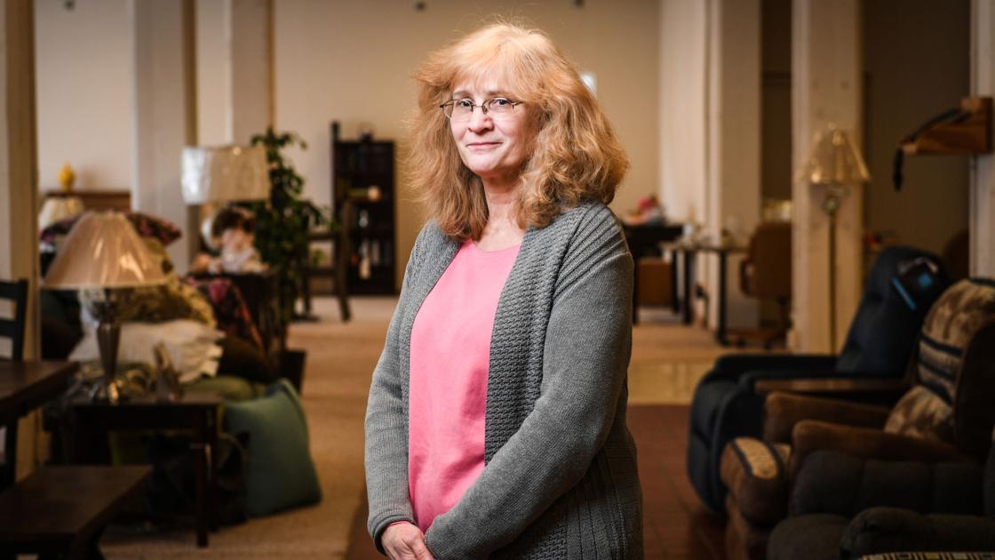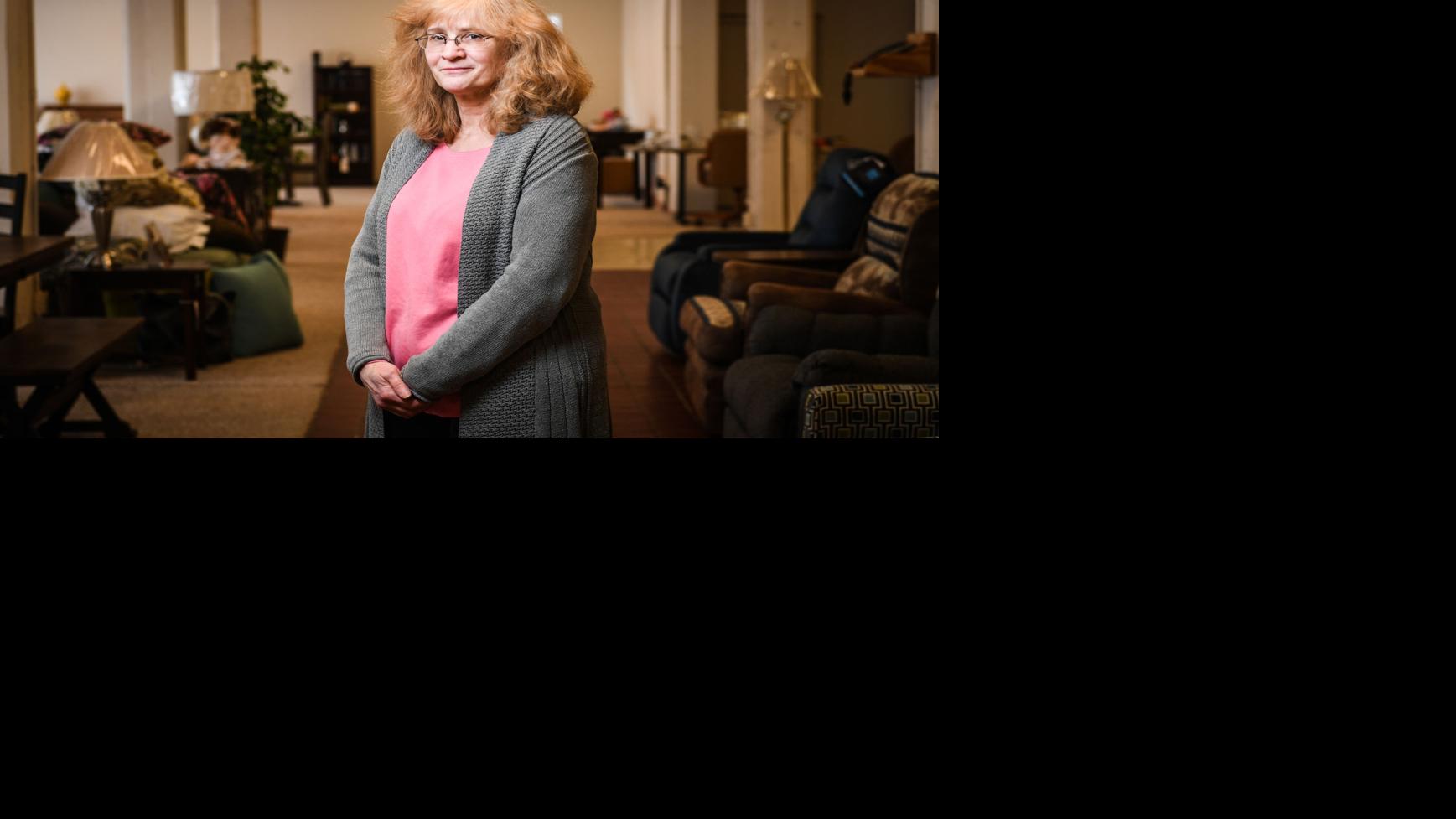 Lisa Vinar, of Dan Vinar Furniture, poses for a portrait in the section of the store that ordinarily would be filled with more displays Friday in Rock Island.