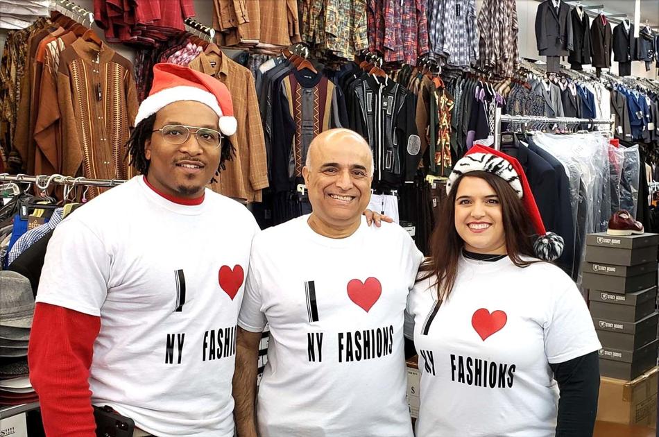 Raja Manglani, center, stands with Carl Smalls, left and his daughter, Erica Watson, in his Radcliff store New York Fashions.