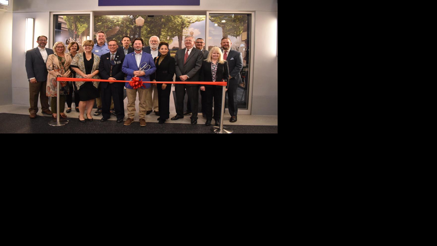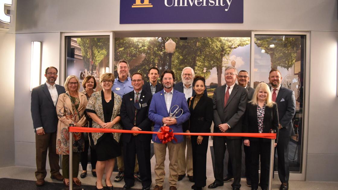 Reinhardt University President Mark Roberts prepares to cut the ribbon on the university's BizTown storefront. with representatives of Junior Achievement, university staff and members of the Board of Trustees.
