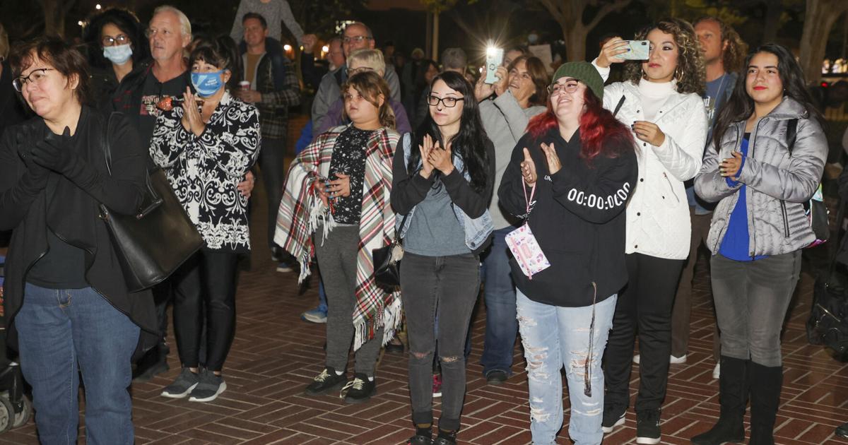 The crowd enjoys the lighting of the menorah to celebrate the first night of Hanukkah at The Marketplace.