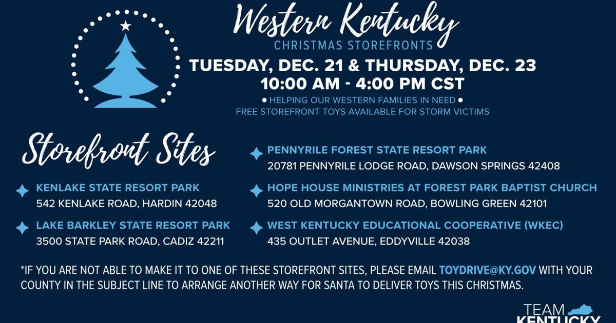 The sites, called Western Kentucky Christmas Storefronts, will be open from 10 a.m. to 4 p.m. CT on Tuesday, Dec. 21, and Thursday, Dec, 23.