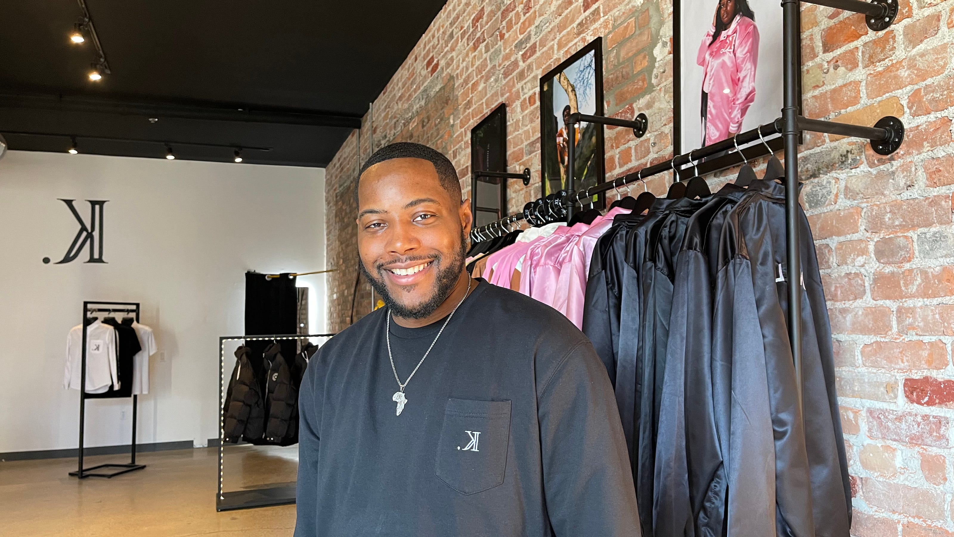 The brand sells a variety of business casual, winter attire and streetwear. Walker's brand includes winter coats, polo shirts, sweatshirts, hoodies, jackets, hats, T-shirts, shorts and hats. The space has brick walls with clothing spread out on fixtures in the spacious room.